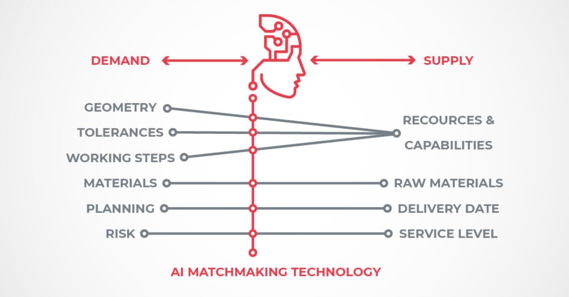 Matchmaking in the metalworking industry requires artificial intelligence to automatically match supply with demand by considering features, tolerances (PMI data), capacity requirements, and lead times. Only AI can handle these diverse variables efficiently to bring the right products together with the right machines and suppliers—creating greater agility in the supply chain and value chain through seamlessly connected processes and smarter product routing.